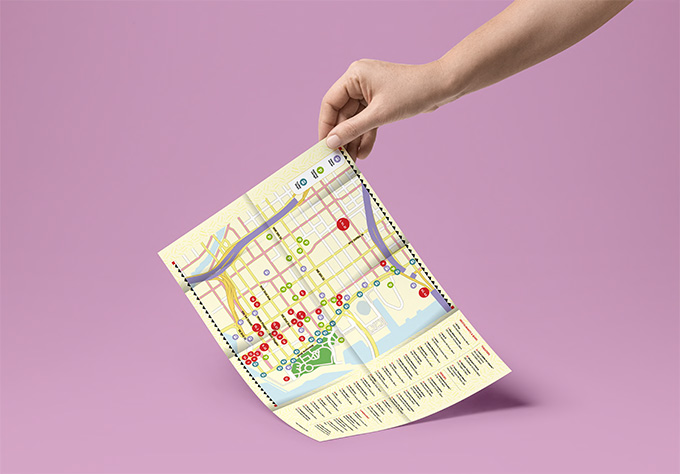 Furthermore, our design team created a map that was passed out to approximately 10,000+ people, filmmakers, producers, talent and industry professionals from around the world, who had traveled to town for the Miami Film Festival. The map acted as a guide of all the restaurants and happenings that were going on during the week of the festival. This was the Festival’s first year where the majority of the Festival was taking place in Downtown. This Guide included official events, best ways to get around, and a curated list of local hot-spots, restaurants, and bars. This was distributed at screening venues and in the Headquarter hotel and given to all guests as their best method to familiarize themselves with the area. This quickly became a festival favorite, and an essential tool to further engage the community and activate the city during the Miami Film Festival.